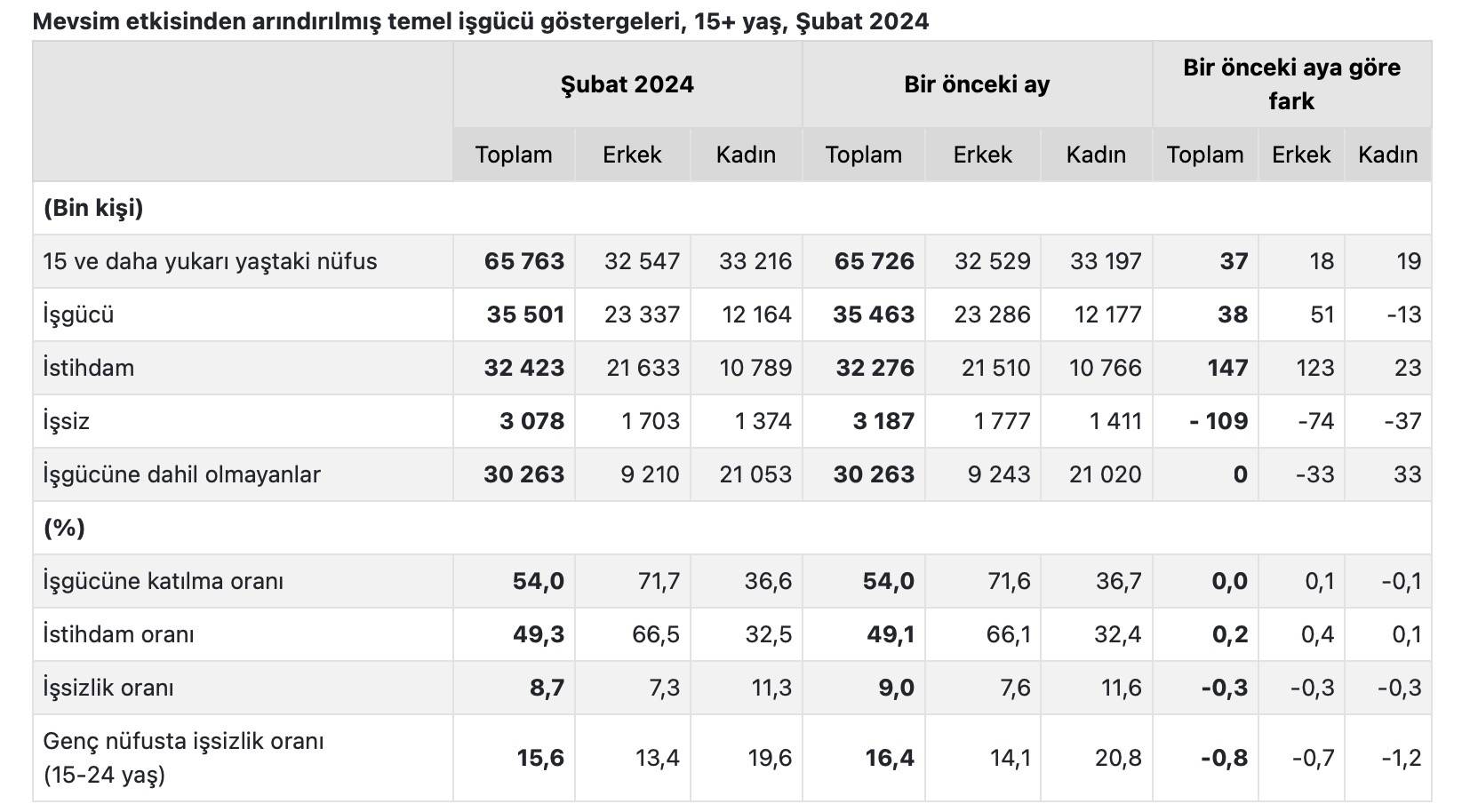 Hanehalkı İşgücü Araştırması sonuçlarına göre; 15 ve daha yukarı yaştaki kişilerde işsiz sayısı 2024 yılı Şubat ayında bir önceki aya göre 109 bin kişi azalarak 3 milyon 78 bin kişi oldu. İşsizlik oranı ise 0,3 puan azalarak %8,7 seviyesinde gerçekleşti. İşsizlik oranı erkeklerde %7,3 iken kadınlarda %11,3 olarak tahmin edildi.Mevsim etkisinden arındırılmış işgücüne katılma oranı %54,0 olarak gerçekleşti