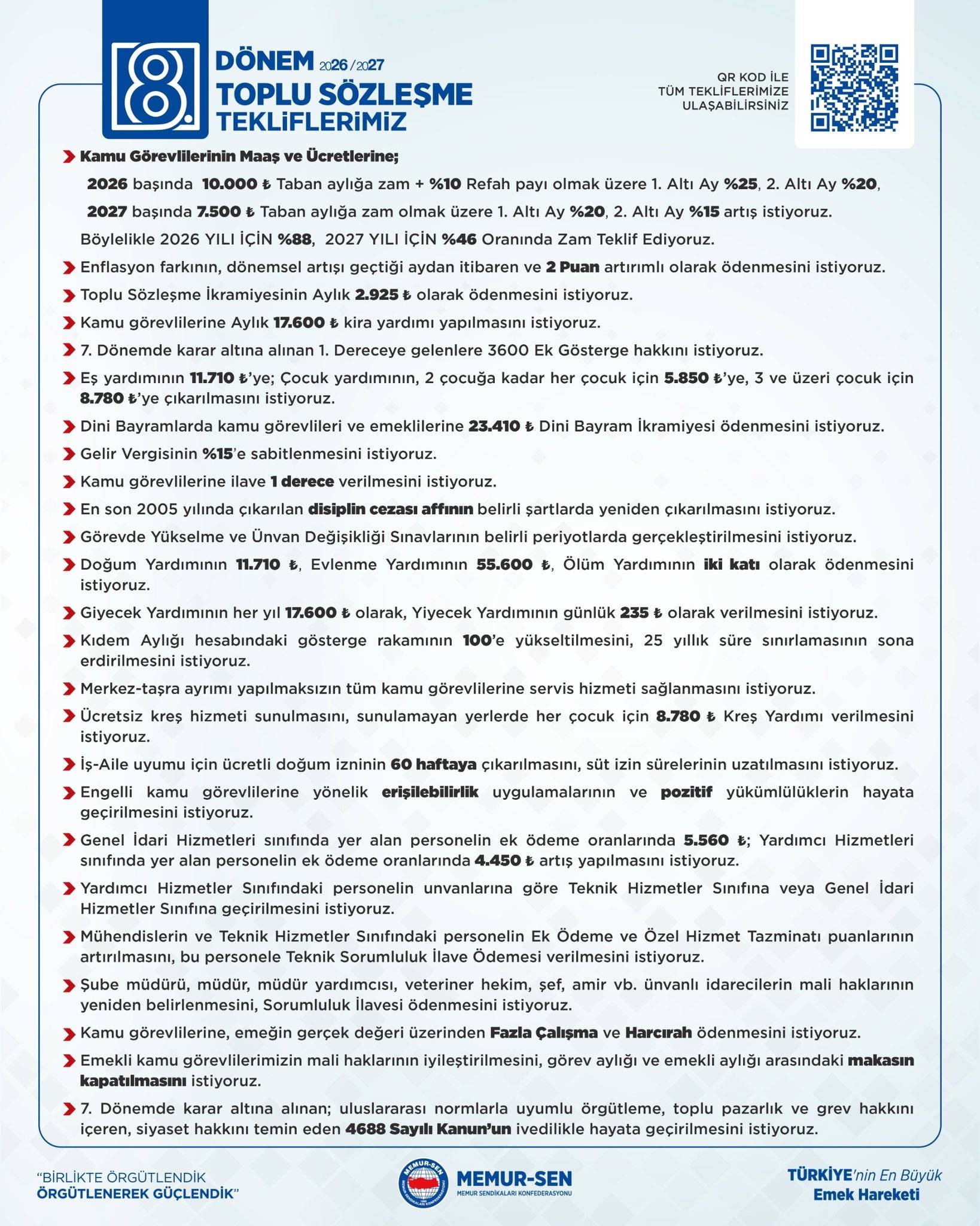 İşte o teklif, “8. Dönem Toplu Sözleşme Tekliflerimiz Yetkili konfederasyon olarak, kamu görevlileri ile emeklilerinin 2026-2027 yıllarını kapsayacak maaş ve ücret artışlarıyla, diğer mali ve sosyal haklarının görüşüleceği 8. Dönem Toplu Sözleşme Tekliflerimiz: 2026 için 6’şar aylık dönemler itibariyle; {10.000 TL (Taban Aylığı)+ %10 (Refah Payı) + %25} + {%20] Olmak üzere toplamda %88 artış teklif ediyoruz. 2027 için 6’şar aylık dönemler itibariyle; {7.500 TL(Taban Aylığı) + %20 + {%15] Olmak üzere toplamda %46 artış teklif ediyoruz. 4 milyona yakın kamu görevlisi, 2 milyondan fazla kamu görevlisi emeklisini kapsayan 8. Dönem Toplu Sözleşme tekliflerimizin milletimize ve kamu görevlilerine hayırlı olmasını diliyoruz” (BSHA – Bilim ve Sağlık Haber Ajansı)